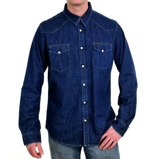Men shirt 100% Cotton Garment Washed in Denim Full Button Front, pockets and decorative front flap